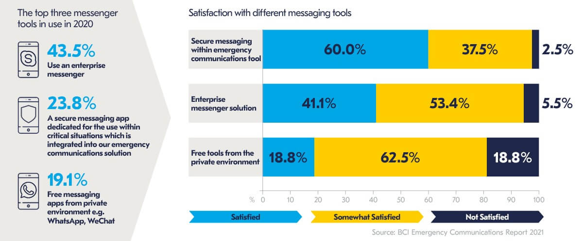 Les entreprises et les organisations optent de plus en plus pour ce type d’outil de communication, car elles ont compris l’importance d’un processus de communication sécurisé en cas de crise. Certains résultats révélés par le Rapport sur la communication d’urgence 2021 du BCI révèlent que le taux d’utilisation des applications de messagerie gratuites comme WhatsApp a significativement diminué. Un nombre significatif d’organisations se tournent davantage vers des outils d’entreprise.