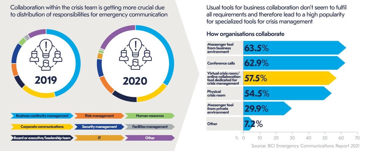 À l’ère du numérique, de nouvelles infrastructures de communication doivent être créées pour permettre d’échanger au sein d’une équipe. Il existe de multiples logiciels dans l’environnement de l’entreprise. En raison de la pandémie, les outils de collaboration d’entreprise sont particulièrement prisés pour créer des espaces numériques. En 2020, ils étaient également utilisés en situation de crise pour coordonner l’équipe de gestion de crise (voir graphique à gauche).